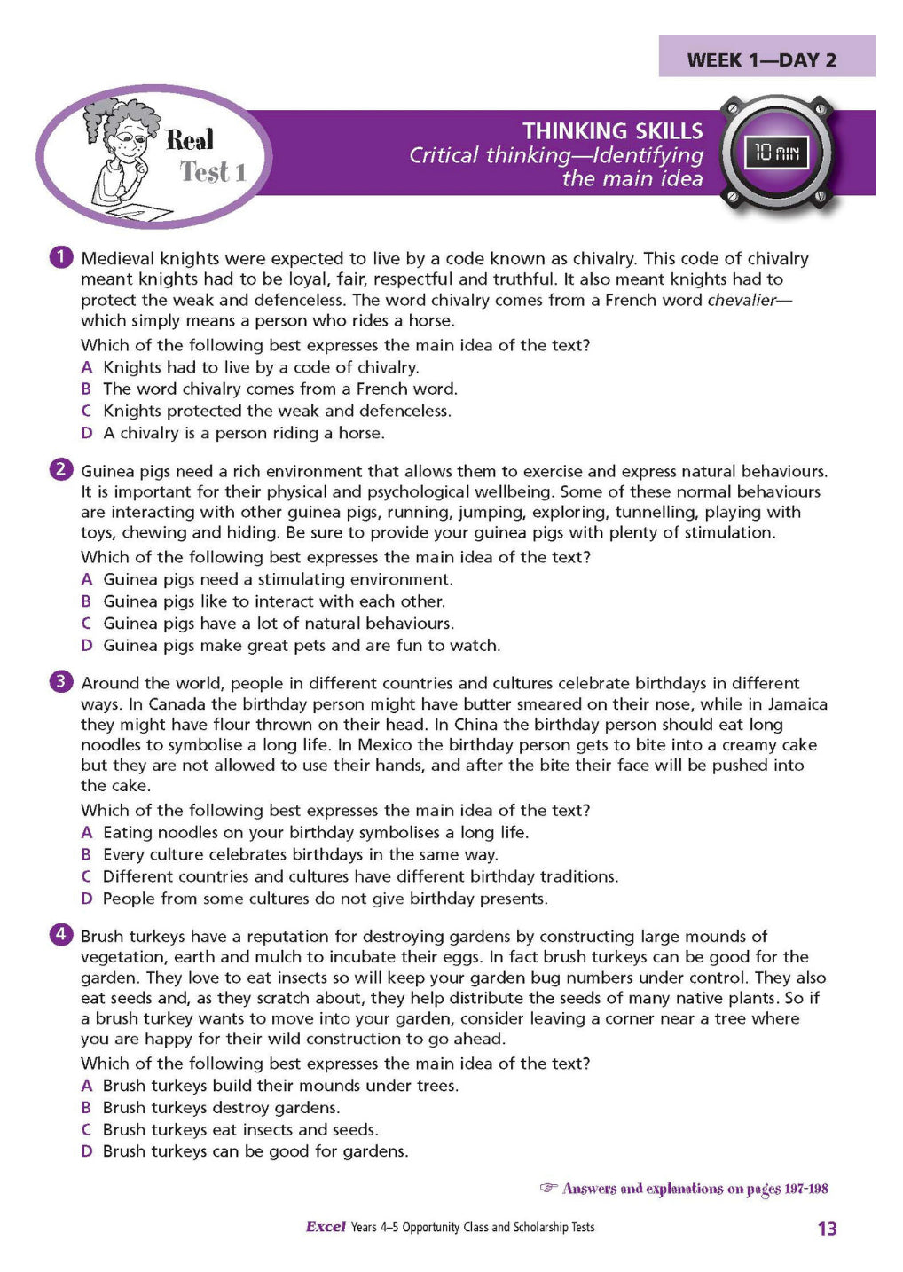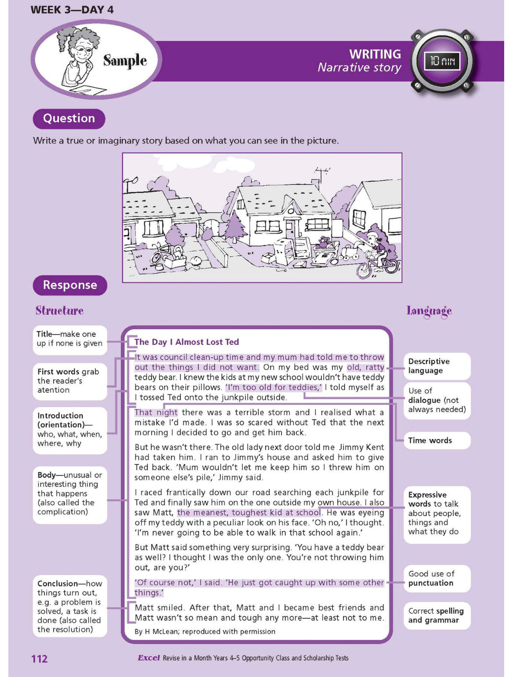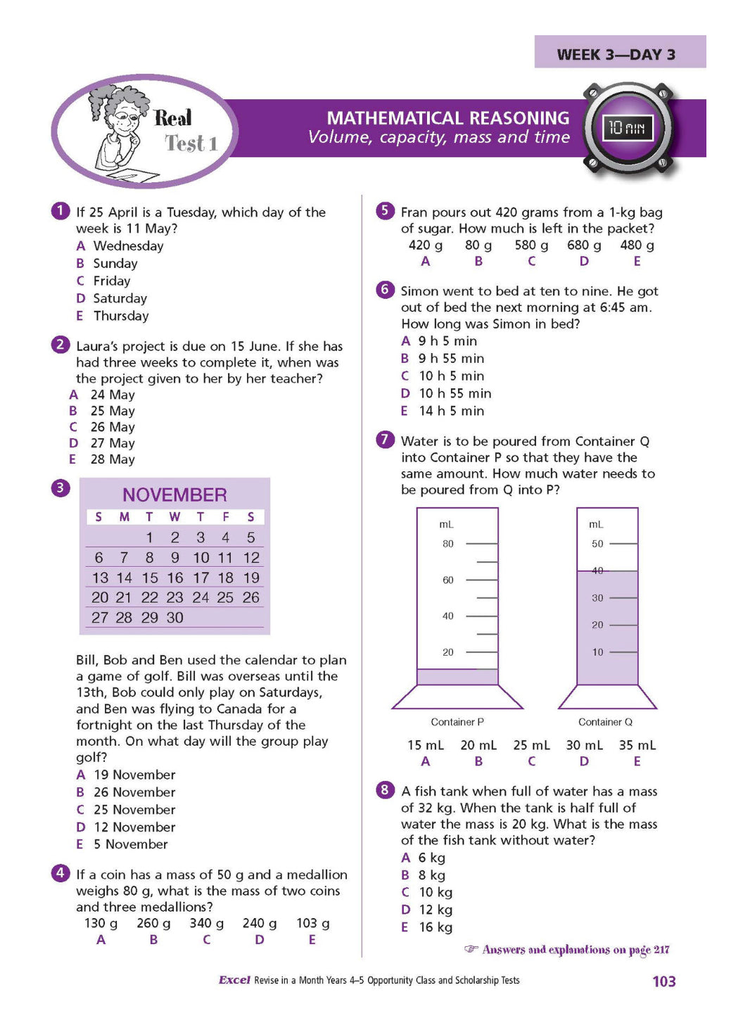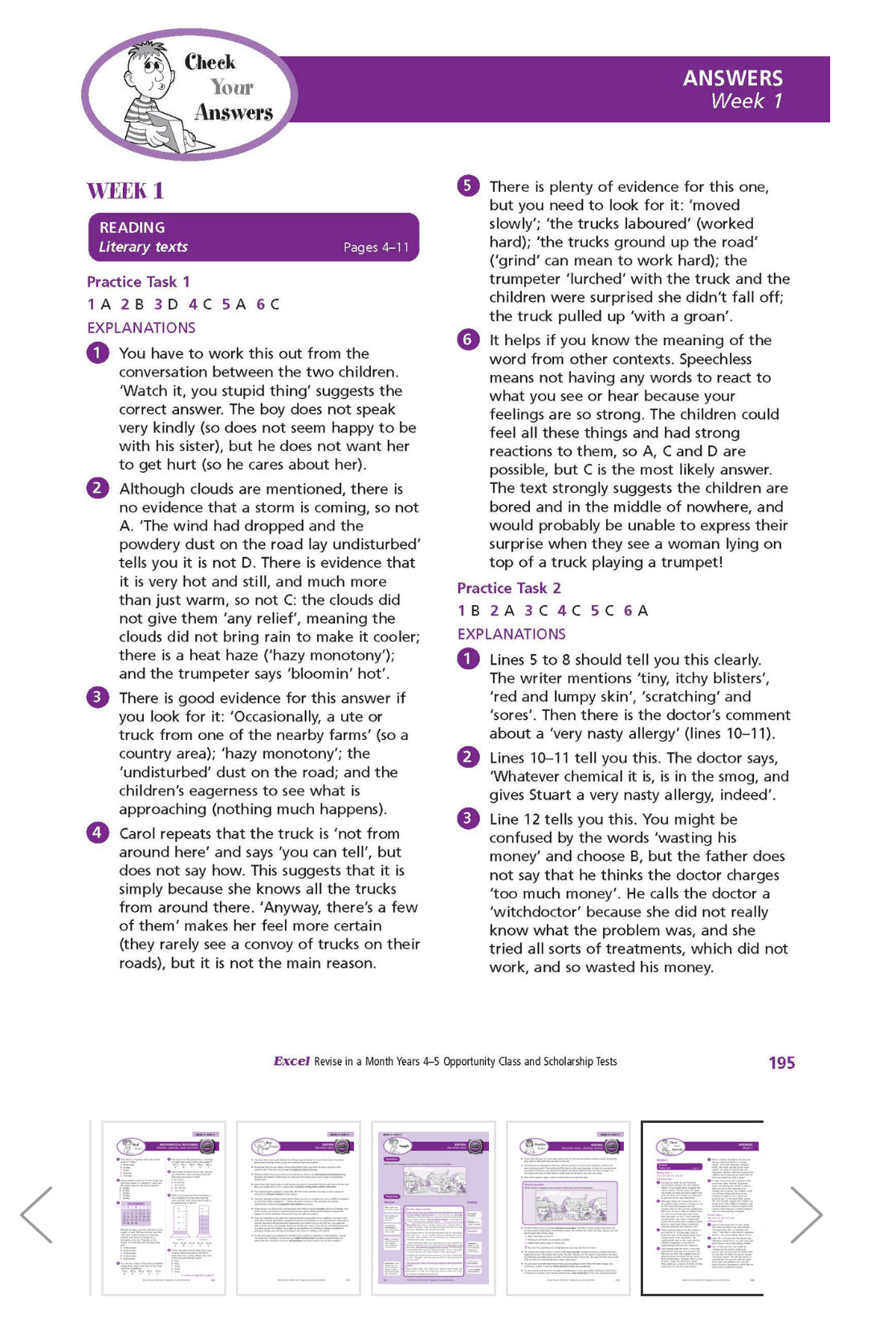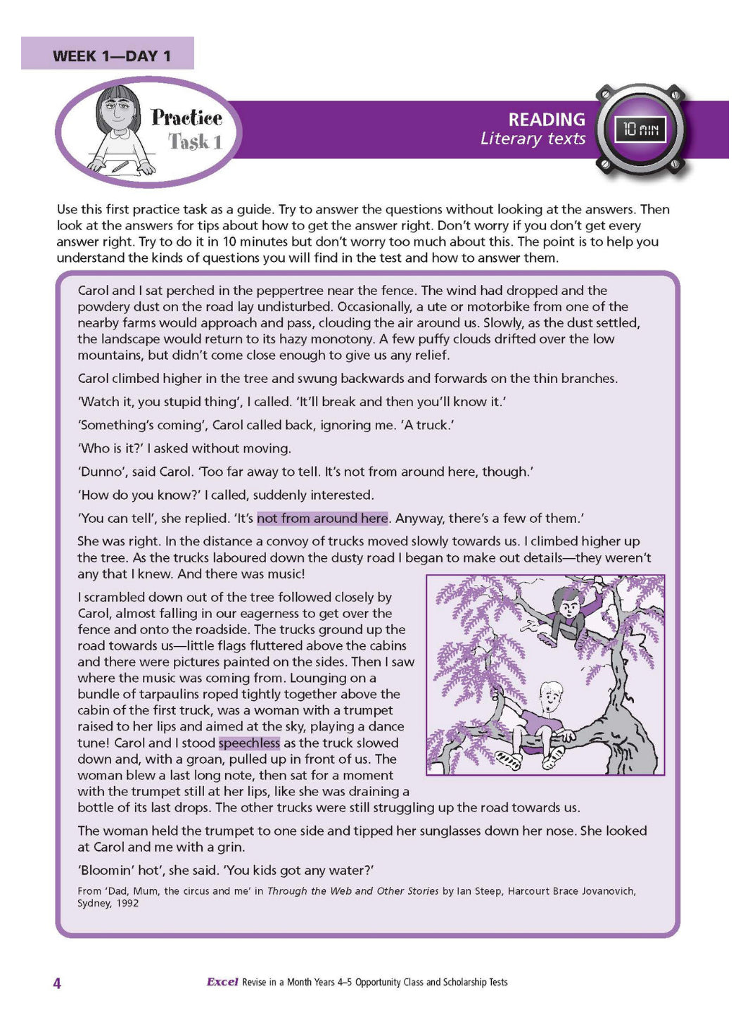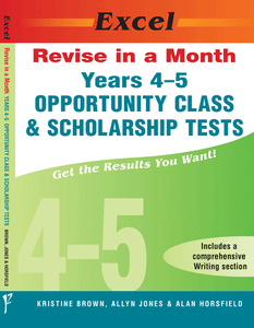 Excel Revise in a Month Years 4–5 Opportunity Class Scholarship Tests: includes an introduction to the NSW Opportunity Class Placement Class and the Primary Scholarship Program (PSP) Test covers the essential areas of these tests: reading comprehension, general ability, maths and, for the PSP, writing provides a balanced four-day-a-week program that tells your child exactly what to study on each day provides a variety of exercises, real test practice, sample Opportunity Class and Scholarship test papers includes fully explained answers to all questions. Excel Revise in a Month Years 4–5 Opportunity Class Scholarship Tests will help your child revise for success with the following features: key Points - provides a detailed summary of each topic, as well as helpful hints and tips sample - supplies model questions and responses to all question types practice tasks - develops the necessary skills to answer questions correctly real test - allows your child to practise questions like those in the real test sample test papers - allows your child to become familiar with the format of the Opportunity Class and Scholarship Tests suggested time - helps prepare your child to answer questions under the time constraints of the Opportunity Class and Scholarship Tests